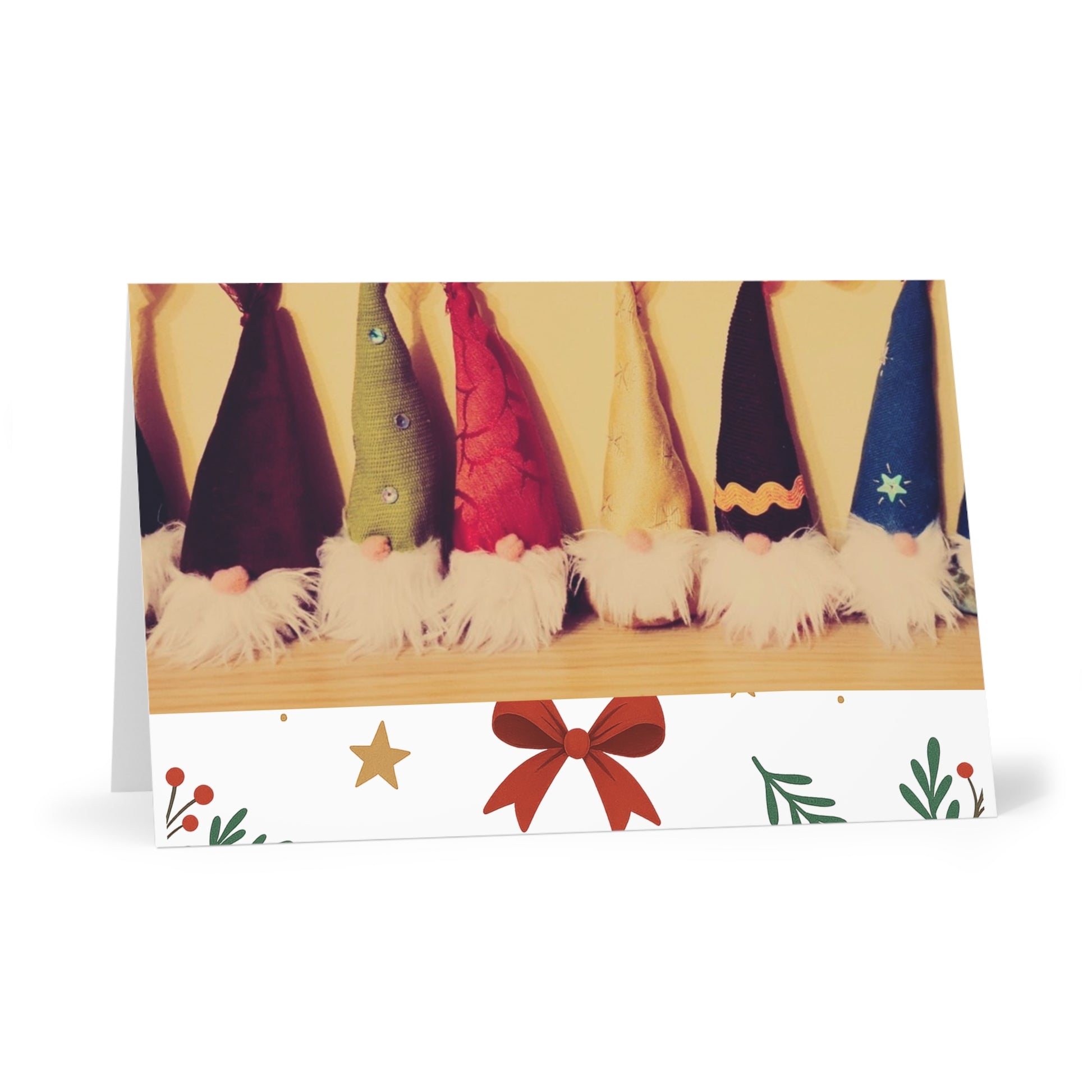 A small set of festive folded greeting cards that bring warm, handmade charm to seasonal moments. Each 5.8" x 8.2" card is printed on sturdy 300gsm paper with a semi-gloss finish so colors pop — the printed side shows an image of the artists homemade Gonks! The interior is left blank for your own note.